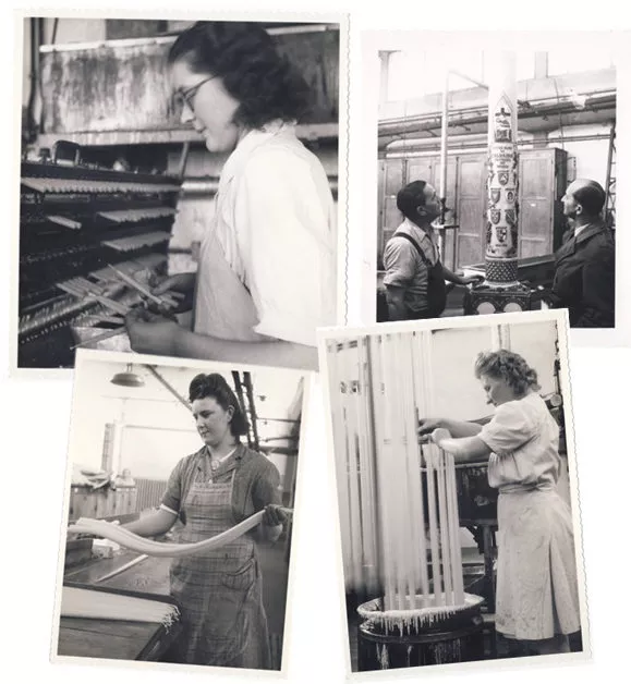 Pendant la Première Guerre mondiale, l’insuffisance de la main d’œuvre masculine (considérée comme plus productive) provoqua l’adoption du procédé « à la trempe ». La production passa à 30kg par heure et par personne.