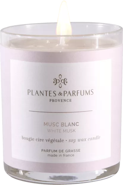 La Bougie Végétale Parfumée Musc Blanc délivre une délicate senteur musquée où se mêlent des notes boisées, animales et des pointes poudrées de Fleur de Coton.