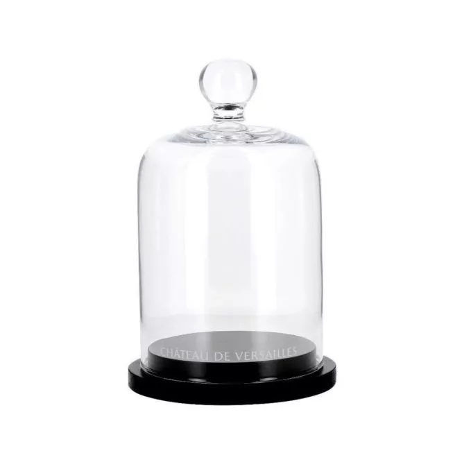 Cloche en verre gravé château de Versailles soufflé à la main avec base en bois foncé.