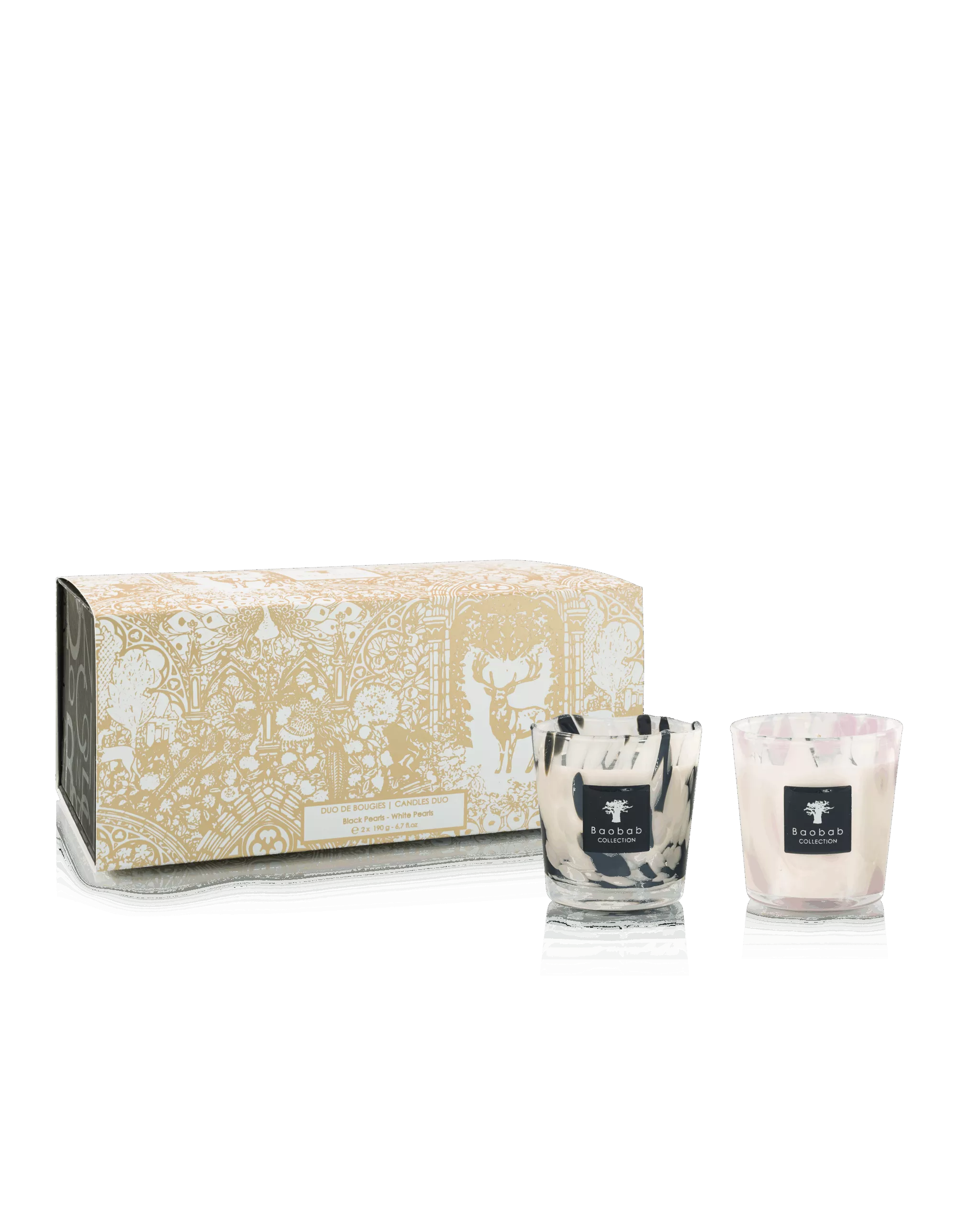 Les bougies iconiques Black Pearls et White Pearls sont éditées en petit format Max 08 et se placent dans un coffret précieux, recouvert d’un emballage doré et blanc. Un merveilleux cadeau à offrir ou à s’offrir, afin de redécouvrir les plus grands succès olfactifs de notre marque.