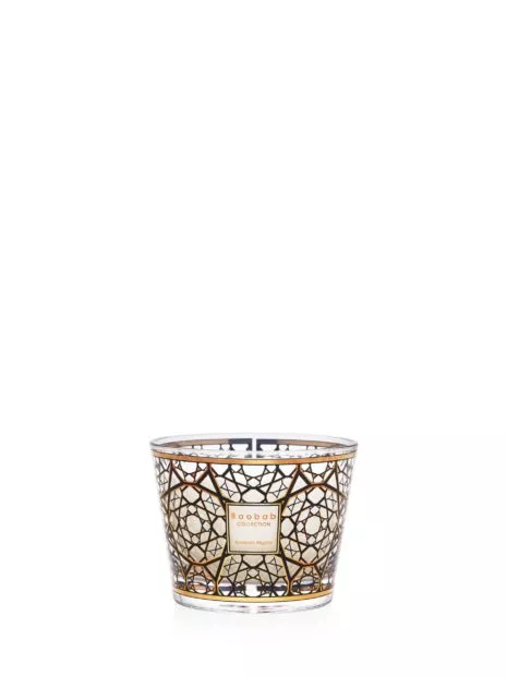 La bougie parfumée Arabian Nights nous transporte dans l’univers mystérieux du Moyen Orient. Le décor de son verre sérigraphié d’or 9 carats s’inspire des célèbres moucharabieh, motifs ajourés que l’on retrouve dans l’architecture arabe. A travers le verre, la flamme apparait créant tout autour des ombres portées.