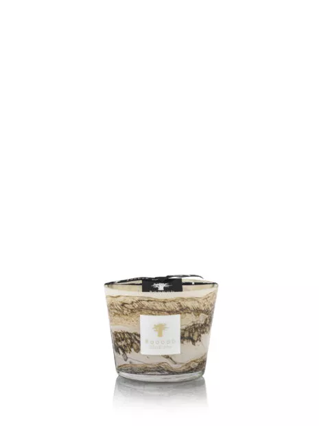 Le verre soufflé bouche de la bougie parfumée Siloli est un camaïeu de beige et brun sur lequel des lignes horizontales sont parsemées de petites alvéoles organiques et aléatoires. Chaque verre est unique et la couleur sable se dissout dans la matière grâce au souffle de l’homme.