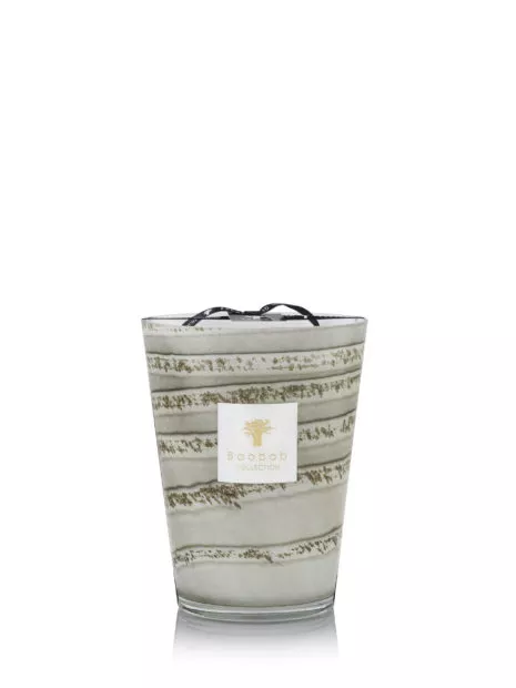 Dans un verre soufflé bouche aux tons subtils de gris, des strates horizontales forment des bayadères parsemées de petits éclats ronds et organiques. La bougie parfumée Atacama est un objet raffiné et unique pour des intérieurs urbains et chics.
