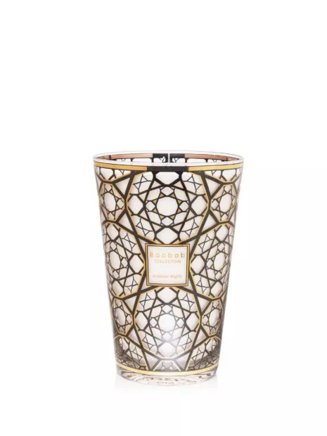 La bougie parfumée Arabian Nights nous transporte dans l’univers mystérieux du Moyen Orient. Le décor de son verre sérigraphié d’or 9 carats s’inspire des célèbres moucharabieh, motifs ajourés que l’on retrouve dans l’architecture arabe. A travers le verre, la flamme apparait créant tout autour des ombres portées.