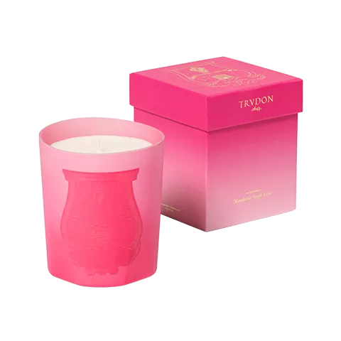Décorées d’un blason Trudon monochrome rose intense, cette bougie parfumée affirme son esprit pop ; sur les boîtes, le marquage à l’or chaud sur des aplats acidulés affiche l’audace de cette collection capsule.