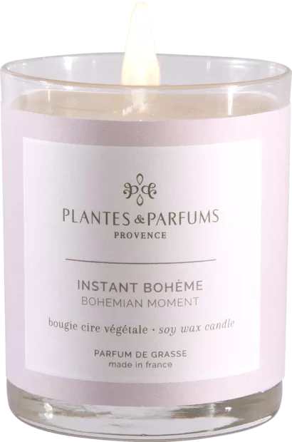 La Bougie Végétale Parfumée Instant Bohème délivre un délicat parfum poudré où les notes fleuries se laissent réchauffer par un fond boisé et musqué.