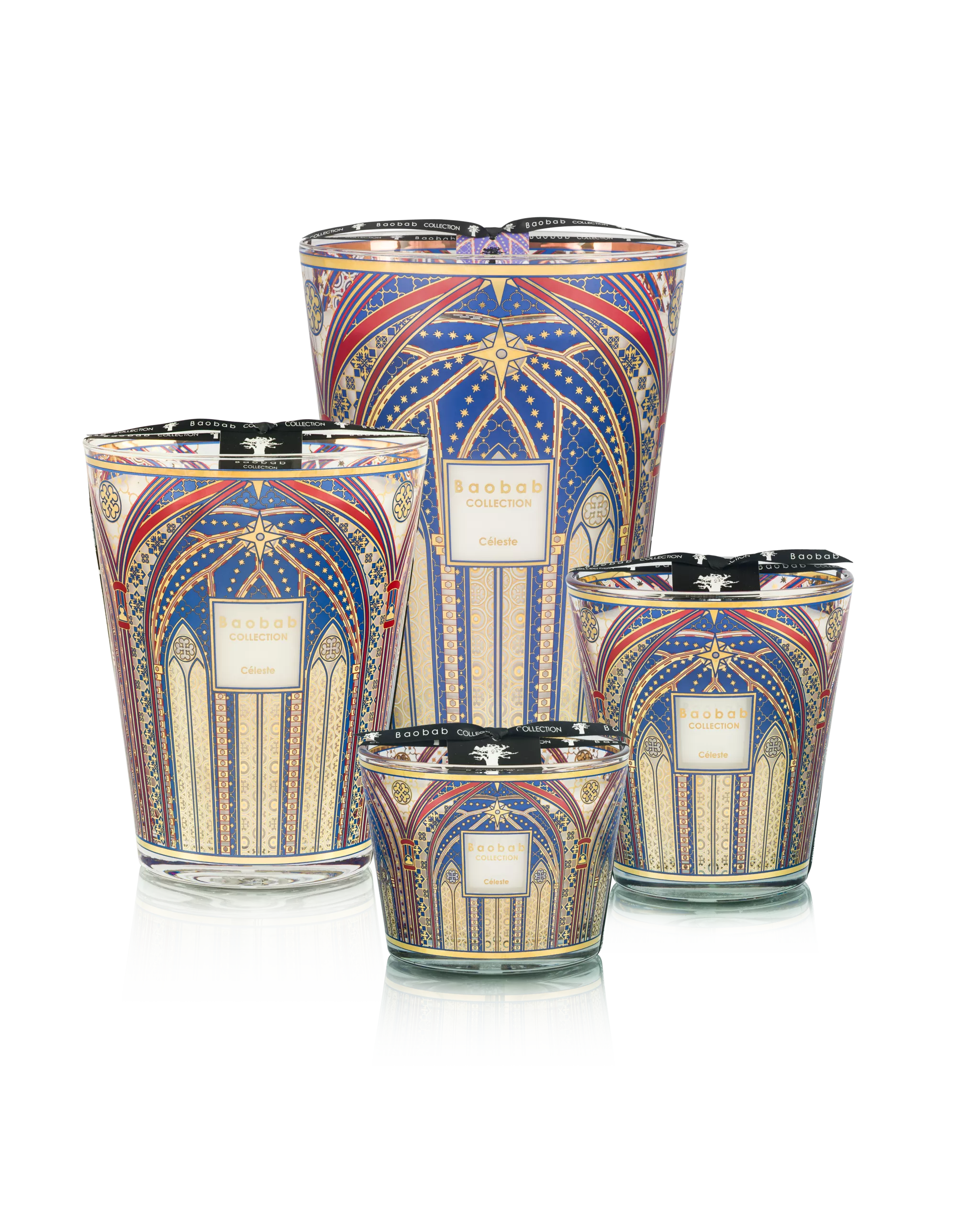 La bougie parfumée Céleste est décorée d’une sérigraphie en or 24 carats et d’un bleu profond, rappelant l’architecture de la voûte céleste de la cathédrale de Cracovie. Le dessin est une interprétation de la nef : un plafond en ogives, peint sur fond bleu et parsemé de petites étoiles dorées. Le décor se place autour du verre comme des portes imaginaires ouvrant vers le ciel. La flamme anime le décor et laisse imaginer une rêverie, nous emportant dans un désir de connexion spirituelle.