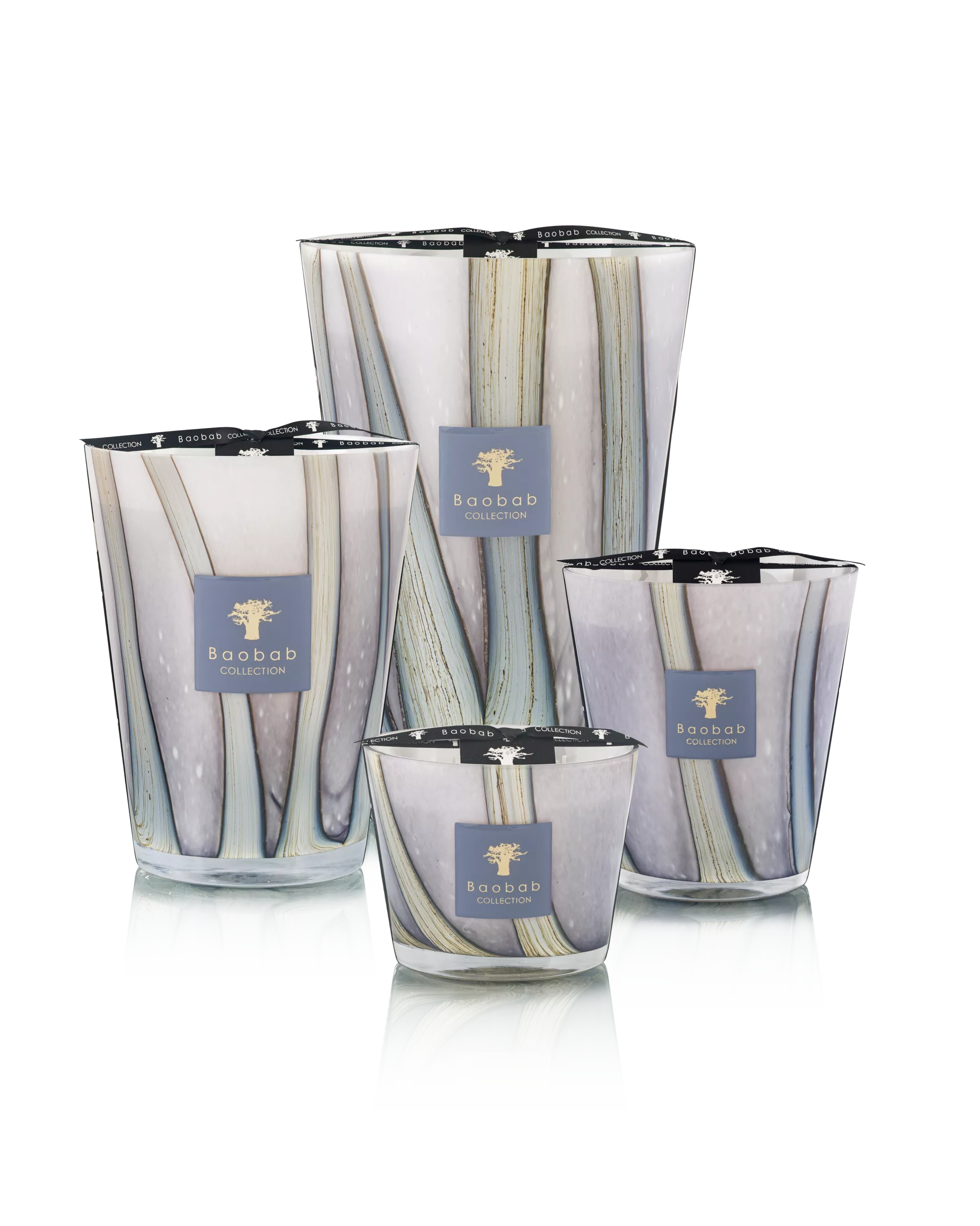 Le verre de la bougie parfumée Brocéliande, aux lignes verticales évoquant les arbres qui s’élancent vers le ciel, oscille subtilement entre gris et parme et dévoile un raffinement infini.