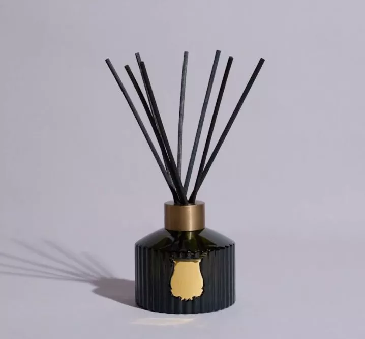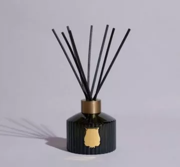 D’une contenance de 350ml, le Diffuseur s’habille du verre cannelé teinté dans la masse emblématique de la manufacture, estampillé d’un écusson Trudon or. Fabriqué dans le même atelier que les bougies, le Diffuseur est coiffé d’une bague en aluminium 100% recyclable qui accueille 8 bâtonnets noirs en rotin naturel.