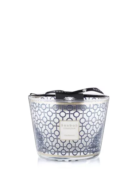 La bougie parfumée est réalisé dans un verre recouvert d’une sérigraphie platine et bleue marine.