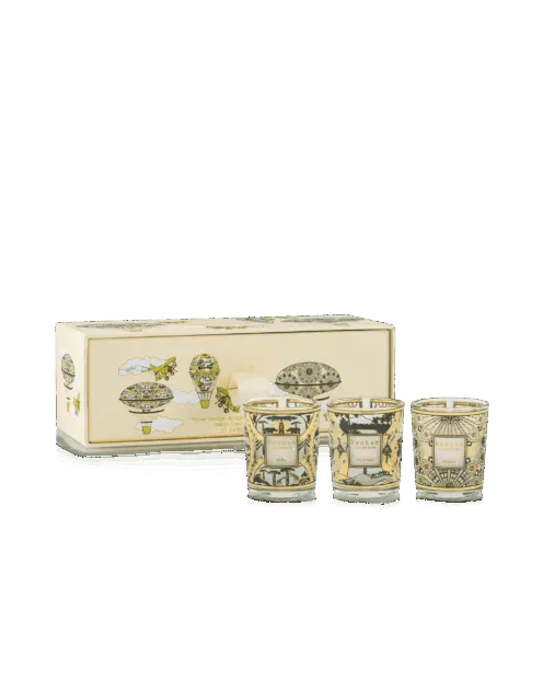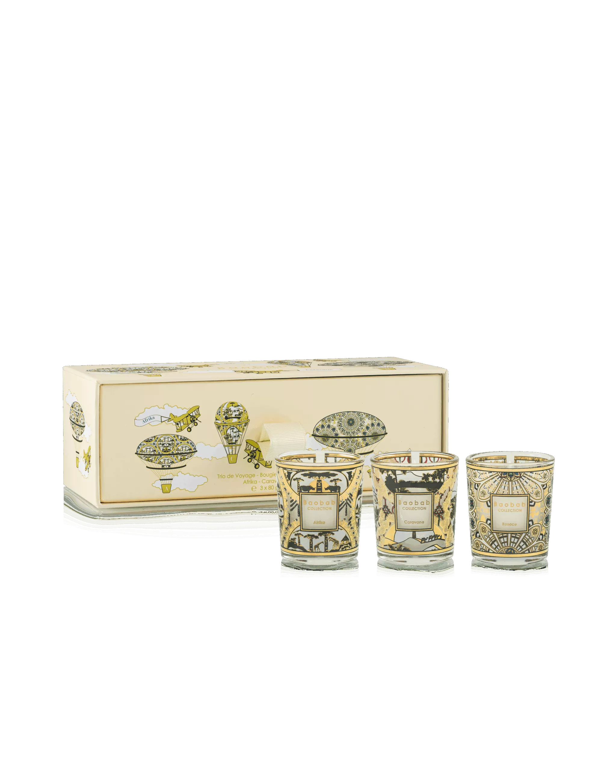 Dans un ravissant coffret décoré de montgolfières — le dessin identitaire de la ligne Travel Trio — trois petites bougies décorées de sérigraphies se placent avec un seul et même parfum : le parfum résineux des fêtes de décembre, aux effluves de sapin, de feu de bois et de vétiver.